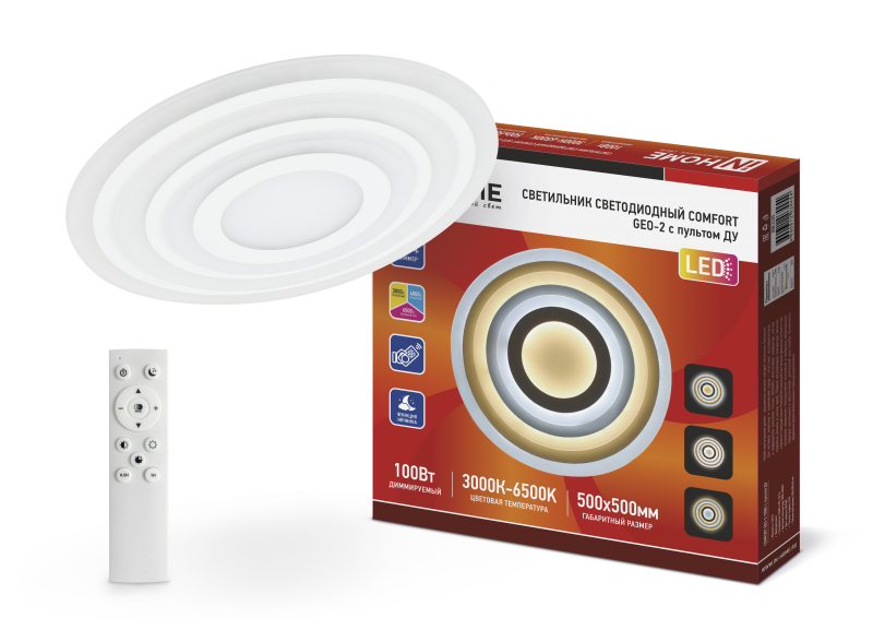 Светильник светодиодный COMFORT GEO-2 100Вт 230В 3000-6500К 7000Лм 500x500мм с пультом ДУ IN HOME - светильник для монтажа в жилых, офисных и общественных помещениях. Походит в качестве основного источника света, благодаря размера и большому световому потому (7000Лм).